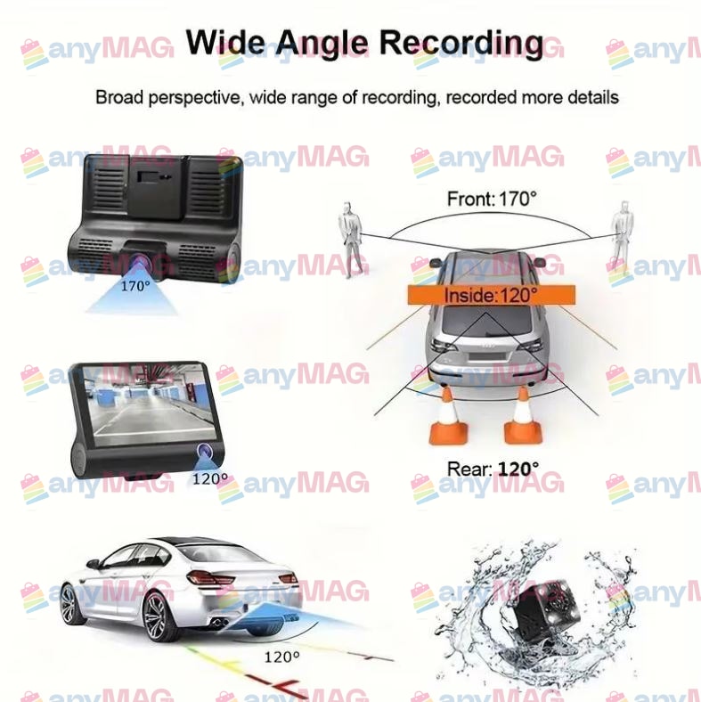 Cameră Auto TRIPLĂ Full HD cu Ecran 4" Touchscreen – Unghi 170°, Camere Față/Spate/Interior, WDR, Funcție Parcare