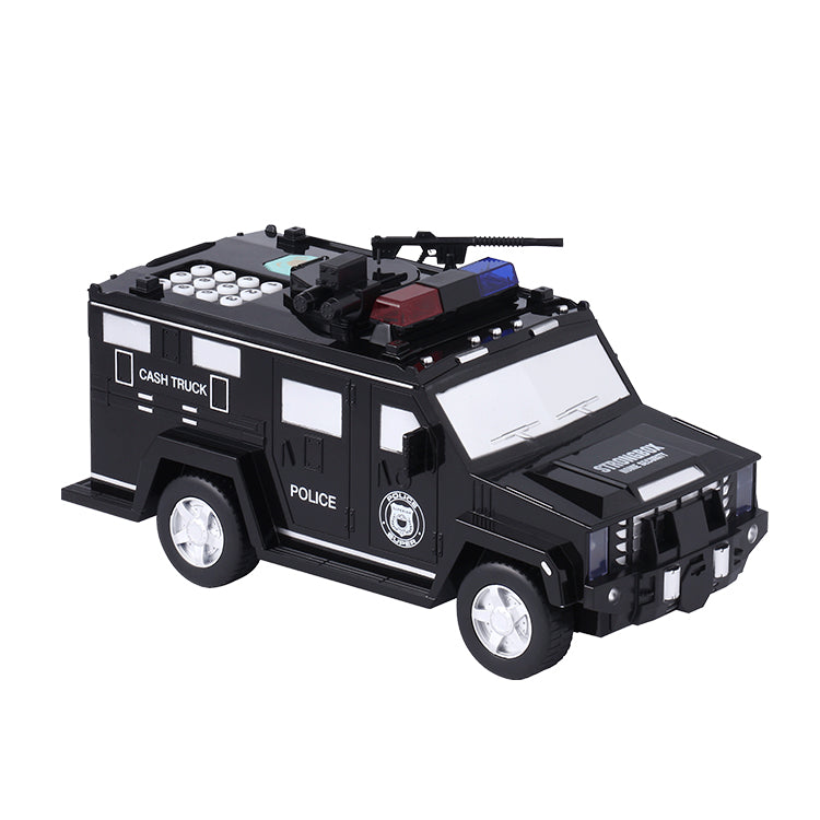Pușculiță Electronică Mașină de Poliție cu PIN – Pușculiță Interactivă pentru Copii, Lumini LED, Slot Bancnote și Monede, Negru