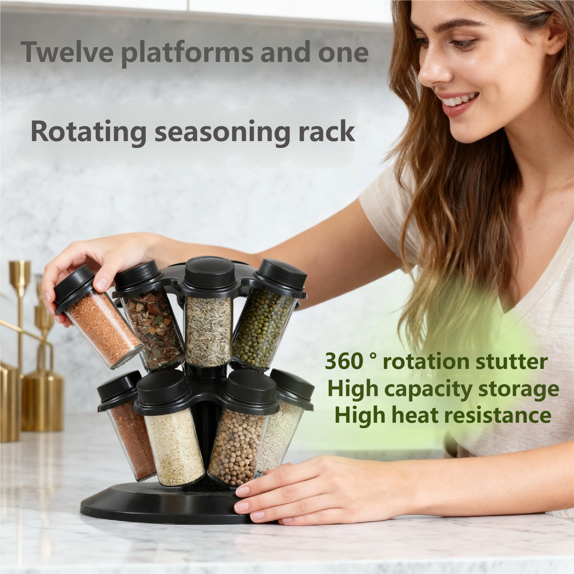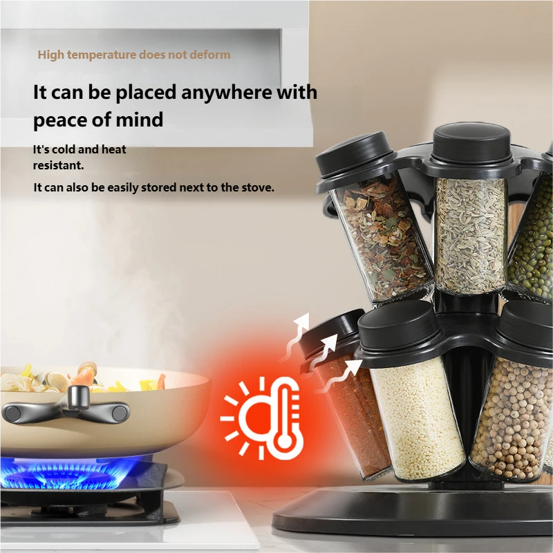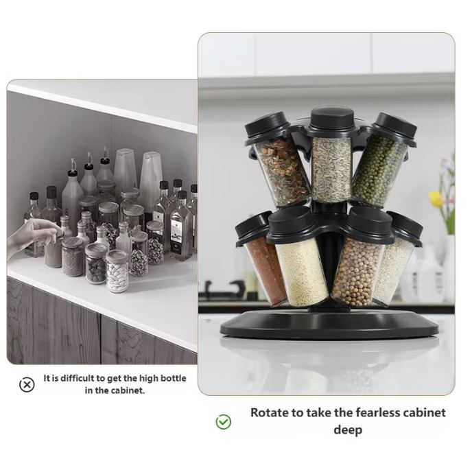 Transformă-ți bucătăria într-un spațiu organizat și elegant cu acest suport rotativ pentru condimente 12 în 1, conceput pentru depozitarea eficientă a condimentelor, ierburilor aromatice și sosurilor.